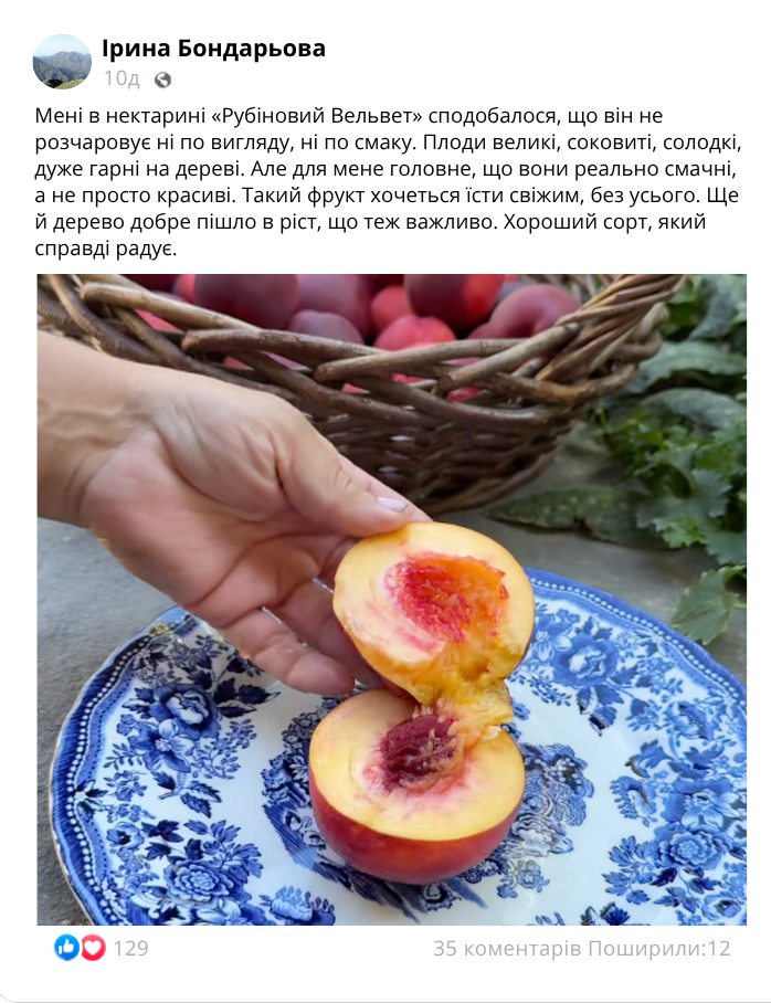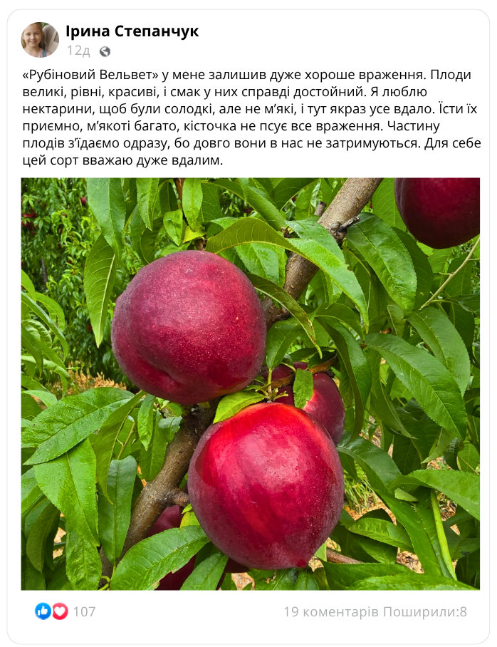 Нектарин «Рубіновий Вельвет» — це великоплідний сорт десертного типу, який цінується за ранній вступ у плодоношення, стабільну врожайність і високі товарні якості плодів.